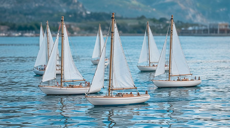 Miniature white wooden sailboats floating on calm, crystal-clear blue water