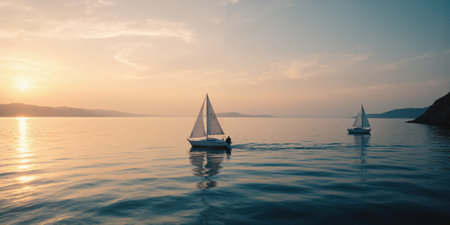 Two sailboats float peacefully on calm ocean waters on a sunny day, Distant sailboats drifting on the calm waters