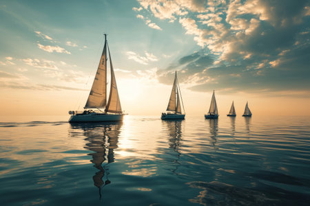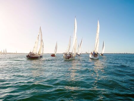 Sailboats compete in a sailing regatta at sunset, sailing race, reflection of sails on water, white color of sails