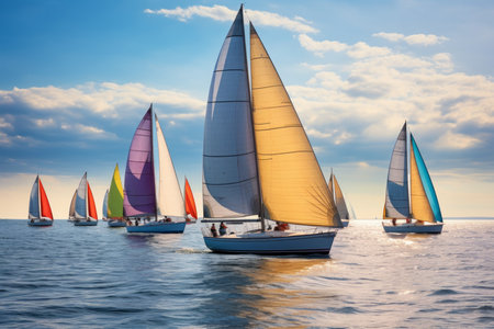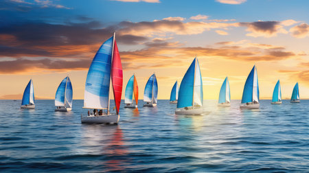 A fleet of vibrant sailboats with colorful sails racing on the blue water of the sea under a clear sky