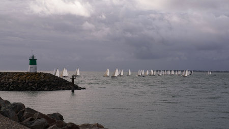 Regatta of small white-sailed boats off the coast of Pornichet in Brittany