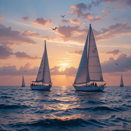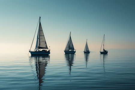 Experience a breathtaking view of sailing yachts gliding through soft fog on a calm ocean at sunrise, capturing the tranquility of nature's beauty.