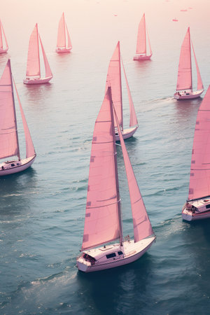 Aerial view Beautiful pink sailboats sailing in a team, Racing sail boats, ships race in the ocean waves, Travel and tourism at sea, AI Generative.