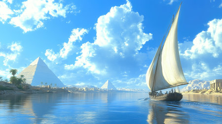 Discover the tranquility of a sailboat gliding on the Nile, framed by majestic pyramids and bright blue skies, capturing the essence of Egyptian beauty.