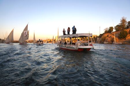 ASWAN, EGYPT - FEBRUARY 2, 2016: Wooden boats carrying passengers along the Nile River in Egypt, North Africa