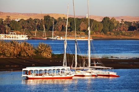a horizontal view of a Nile scenic with some boats, Egypt