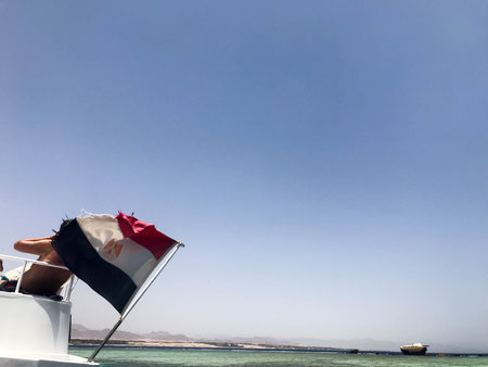 Flag of Egypt waving from the boat on Nile river.