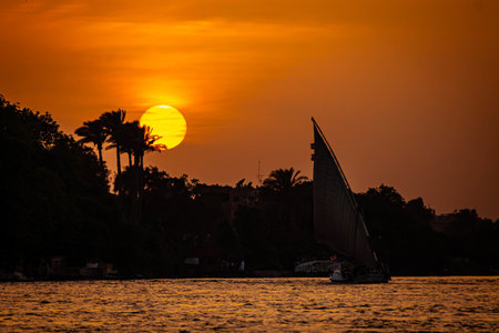 Felucca sailing on Nile River during sunset at Aswan, Egypt