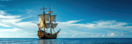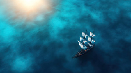 An elegant sailing ship with white sails glides gracefully across the deep blue sea, illuminated by a distant sun, evoking a sense of adventure and exploration.