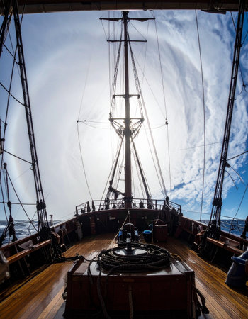 From the polished wooden deck of a historic tall ship, the view forward is one of endless possibility. The sun creates a brilliant halo behind the main mast as the vessel cuts through the vast blue ocean, embarking on an epic journey of adventure and discovery.