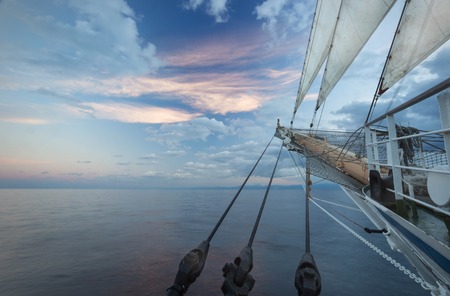 Sailing yacht in the open sea. View from the deck to the bow and sails.