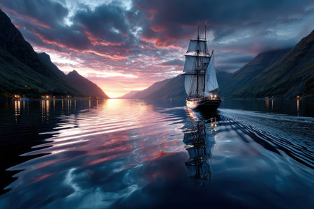 A sailing vessel navigates the serene waters of a fjord as the sun sets, casting vibrant colors on the landscape.