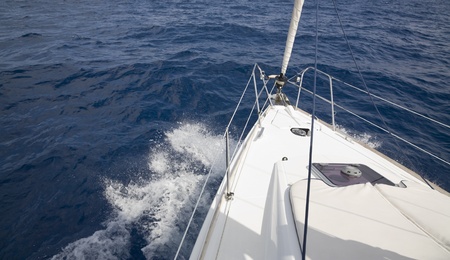 Yachting on sail boat bow stern shot splashing sea water. Sporty transportation conept.