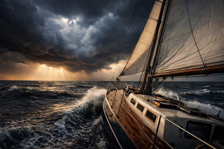 Stormy seas sailing adventure with dramatic sky and ocean waves for thrilling maritime experience, concept of nautical exploration, sea voyage, adrenaline rush.