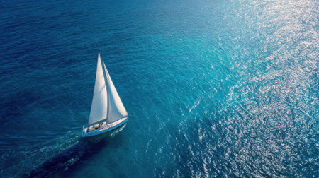A sailboat glides across deep blue ocean water, its white sails catching the light. The composition is aerial with visible texture created by the water's surface. The scene evokes a sense of freedom. This image could be used for commercial projects requiring marine or travel themes.