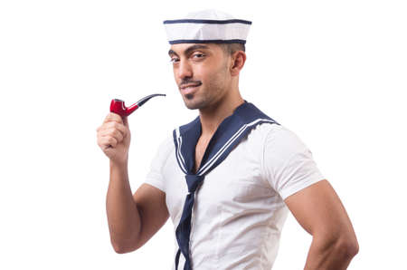 Attentive sailor. Old sailor with a smoking pipe on a blue background isolated