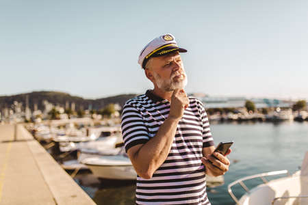Mature man standing near the sea dressed in a sailor's shirt and hat using smart phone