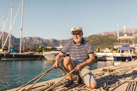 Mature man on pier dressed in a sailor's shirt and hat holding a sailor rope