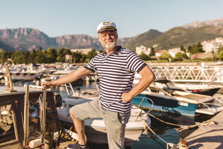 Portrait of caucasian man in marine captain's cap and sunglasses with blue ocean and blurred white yacht in background.