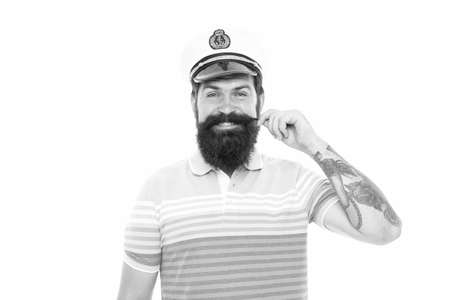 Born to play with storms and winds. Sea captain isolated on white. Happy captain twirl mustache. Captain commander of ship. Bearded man in captain uniform. World cruise. Marine adventure. Sea travel