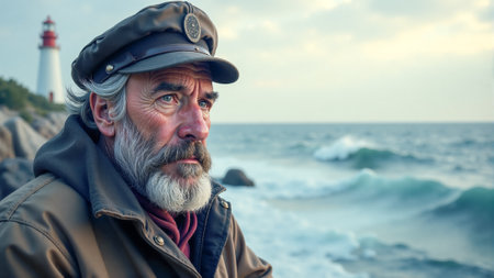 A skilled mariner, dressed in a warm coat and cap, stands near the shore, observing the waves crashing against the rocks while a distant lighthouse illuminates the coast under a gray sky.