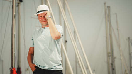 Handsome fashion man tourist on pier in port with yachts. Guy enjoying summer travel vacation by sea.