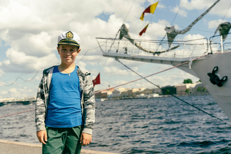 Adorable school-age boy wearing a captain's cap standing near the ship, with the clear blue water in the background.