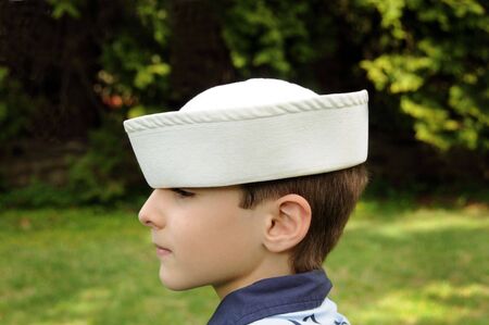 Portrait of a young boy in a sailor hat.