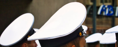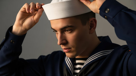 Young caucasian male sailor adjusting white cap in navy uniform.