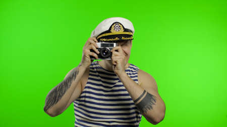 Young muscular sailor man photographer takes a photo on a retro camera. Seaman guy smiling in sailors vest. Striped navy white and blue shirt, captain nautical hat. Isolated on chroma key background