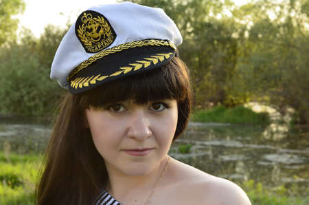 Close-up portrait of a beautiful young woman in a sailor cap on the seashore