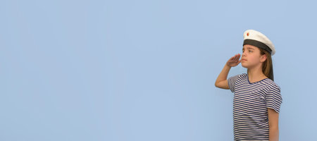 Portrait - banner of a sailor girl. On a light blue background. Teenage girl in a sailor suit with a sailor salutes