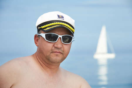 Portrait of caucasian man in marine captain's cap and sunglasses with blue ocean and blurred white yacht in background.