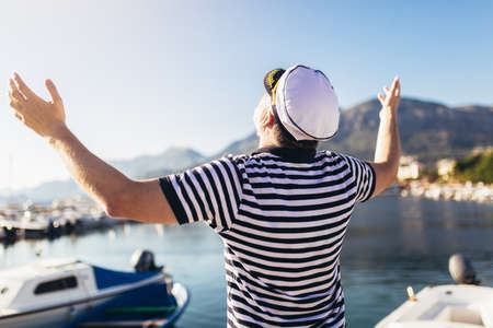 Tourism, travel and marine concept - man in captain hat looks forward