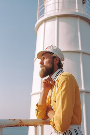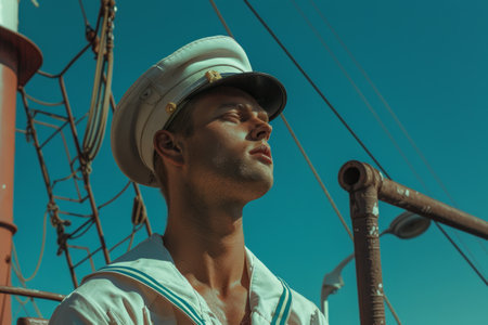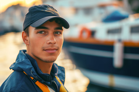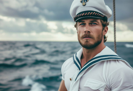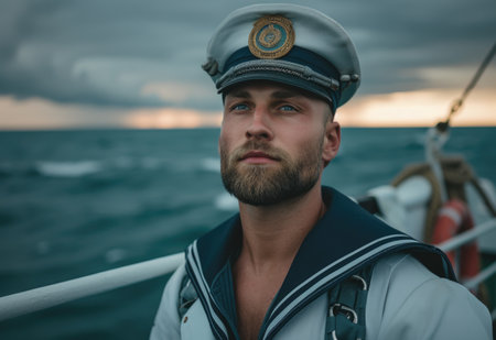 Close-up of a young captain standing on the deck of a ship