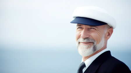 An elderly man with a kind smile, wearing a captains hat, enjoys a peaceful day on a boat as he gazes out at the sea under the warm sun.
