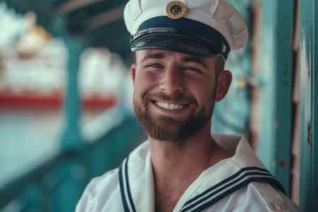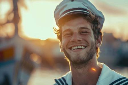 A sailor stands confidently on the deck, wearing a crisp uniform and smiling brightly. The sun shines down, illuminating a tranquil ocean and fellow crew members in the background.
