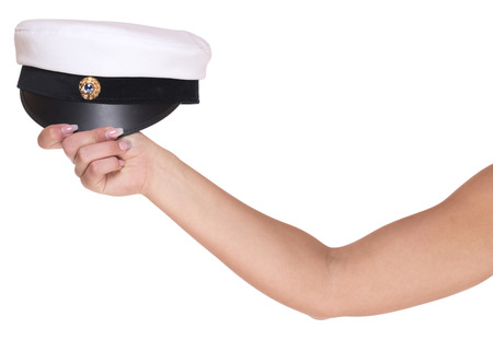 sailors cap on the shelf of the womans hand next to