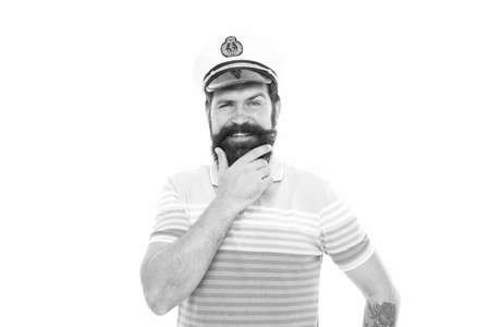Beard rule. Happy sailor with hipster beard. Bearded man in navy uniform isolated on white. Barbershop. Beard barber. Beard grooming. Sea voyage. Marine adventure. Lets go sailing