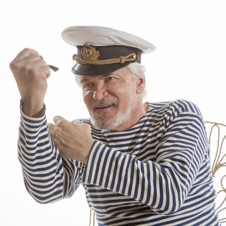 Portrait of old sailor man in striped shirt and hat holding smoking pipe isolated on white background