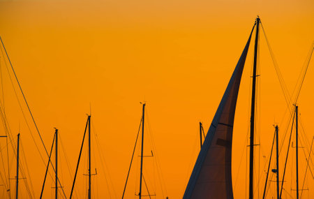 Conceptual view of frout sail boat masts under cloudy sky. Anchored boats before setting off.