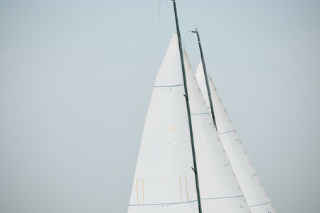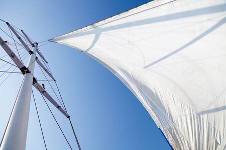 Sails of a modern white sloop rigged charter yacht. Low angle view. Mediterranean sea. Private vessel for rent, cruise, recreation, leisure activity, sport, regatta, rigging equipment