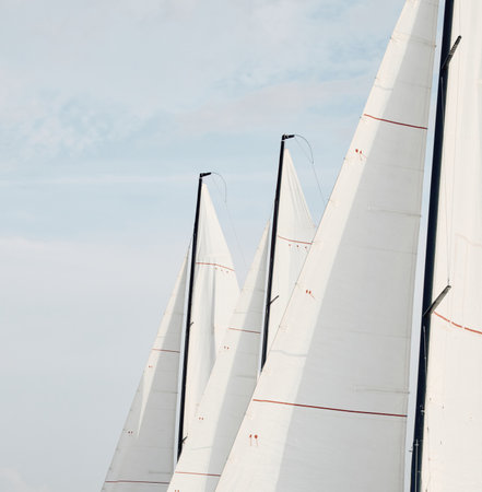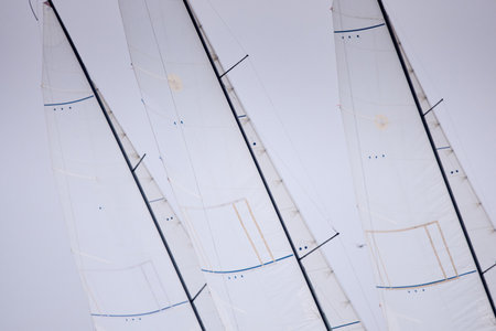 This close-up view showcases the intricate details of the white sails on a sailboat as they catch the wind, billowing gracefully against a clear sky. The focus is on the texture and patterns of the fabric, highlighting the craftsmanship that goes into sailing.