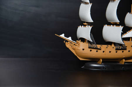 Retro golden compass (sundial), wooden tall ship scale model, old nautical chart close-up. Vintage still life. Sailing, travel, collecting, hobby, souvenir, gift, toy for kids. Playroom interior decor