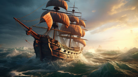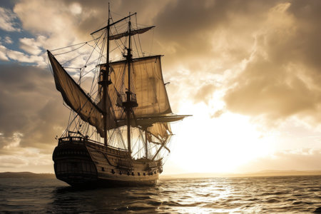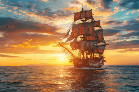 A magnificent historical tall ship with full sails cruises on the open ocean at sunset. The golden light of the setting sun beautifully illuminates the sails and the ship's silhouette, evoking a sense of adventure, exploration, and maritime history.