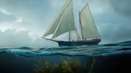 A grand sailing vessel above a deep blue sea, with seaweed and marine life visible beneath the waterline.