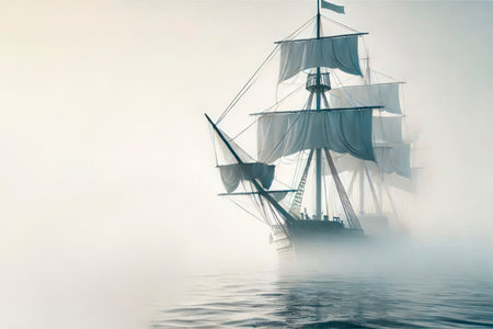 A pirate ship emerges from fog on the ocean at night with dramatic lighting and billowing sails.