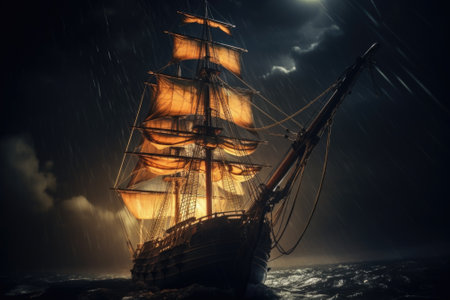 A majestic tall ship sails gracefully across the dark, moonlit ocean. This captivating image can be used to depict adventure, exploration, or the beauty of the sea.