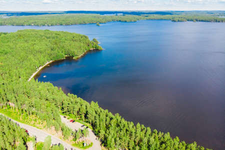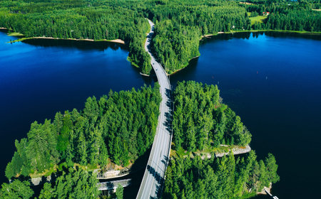 Aerial view of road between green summer forest and blue lake in Finland