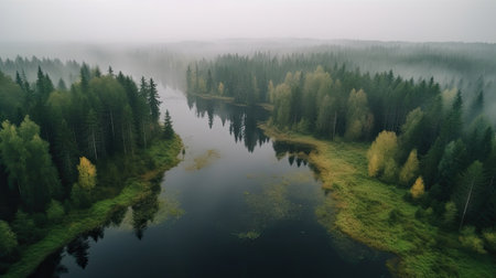 Aerial view of foggy forest and lake. Drone photography.